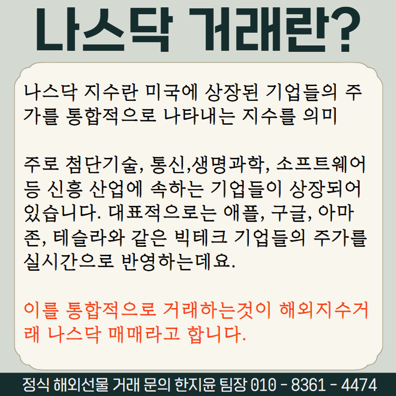 해외지수거래에서 나스닥이란 미국에 상장된 기업들의 주가를 통합적으로 나타낸 지수를 의미합니다.