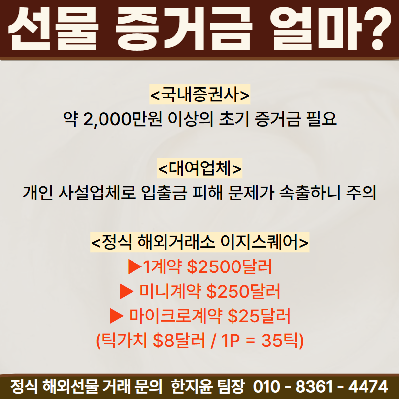 국내 증권사들은 초기 약 2,000만원 이상의 증거금을 예치해야 거래가 가능합니다. 초보자 분들에게는 다소 부담스러운 금액이죠.