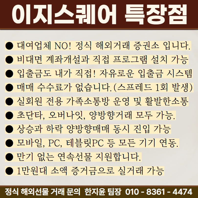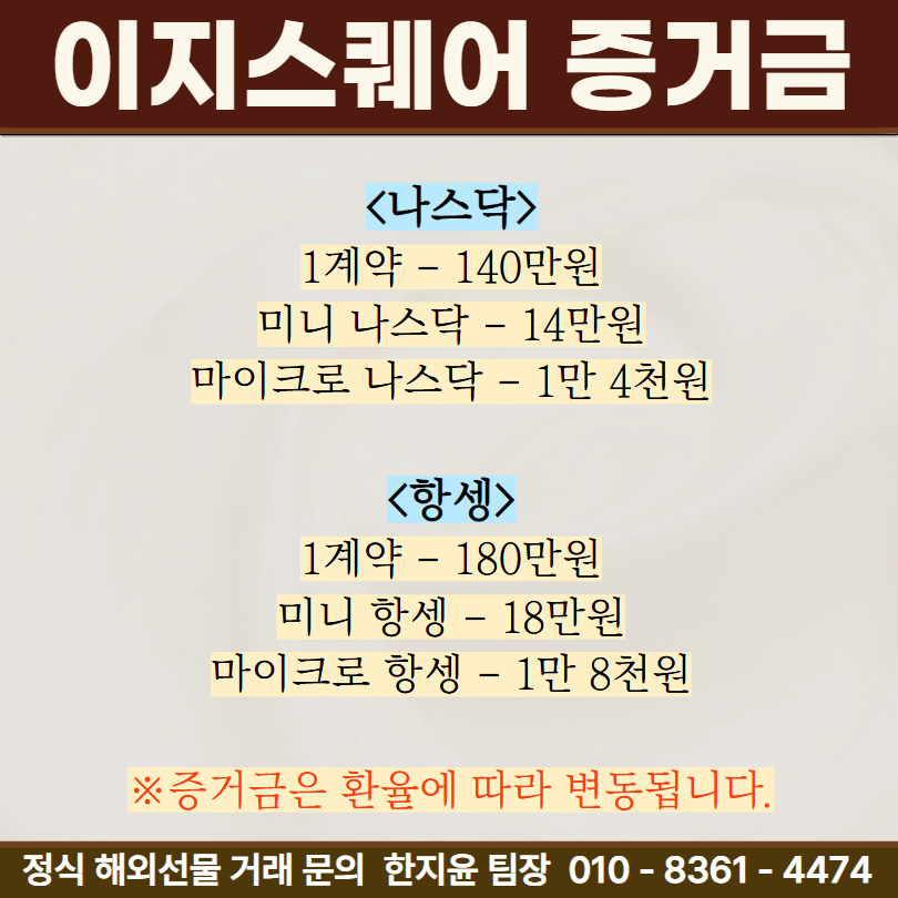 정식 해외선물 거래소 EZ스퀘어에서는 1만원~ 소액증거금 부터 실거래가 가능합니다. 뿐만 아니라 모든 지수거래 가능하며, 모든 지수 마이크로 계약이 가능해 증거금 부담없이 시작하실 수 있습니다.