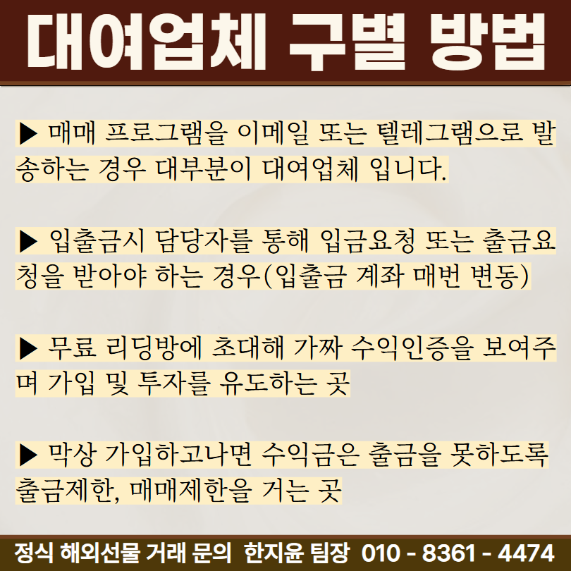 개인사설업체로 입출금 문제와, 리딩피해 문제 등.. 다양한 금전적인 피해가 속출하니 주의하셔야 합니다.