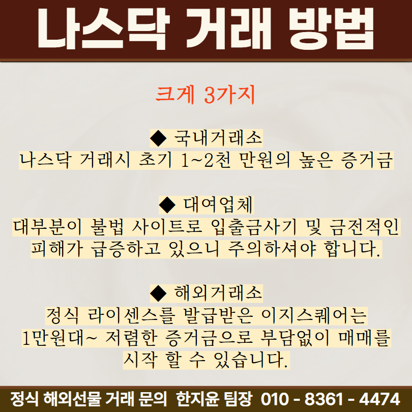 나스닥 거래시 초기 1000~2000만원의 높은 금액의 증거금 예치가 필요합니다. 추가로 일정 교육시간을 이수해야 거래가 가능하기 때문에 시작하는 과정이 다소 번거로울 수 있습니다.