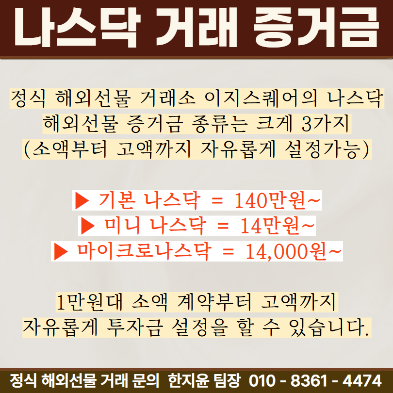 정식 해외선물 거래소 이지스퀘어의 나스닥 해외선물 증거금 종류는 크게 3가지로 나뉘며 내가 원하는 금액대로 자유롭게 설정이 가능하신대요