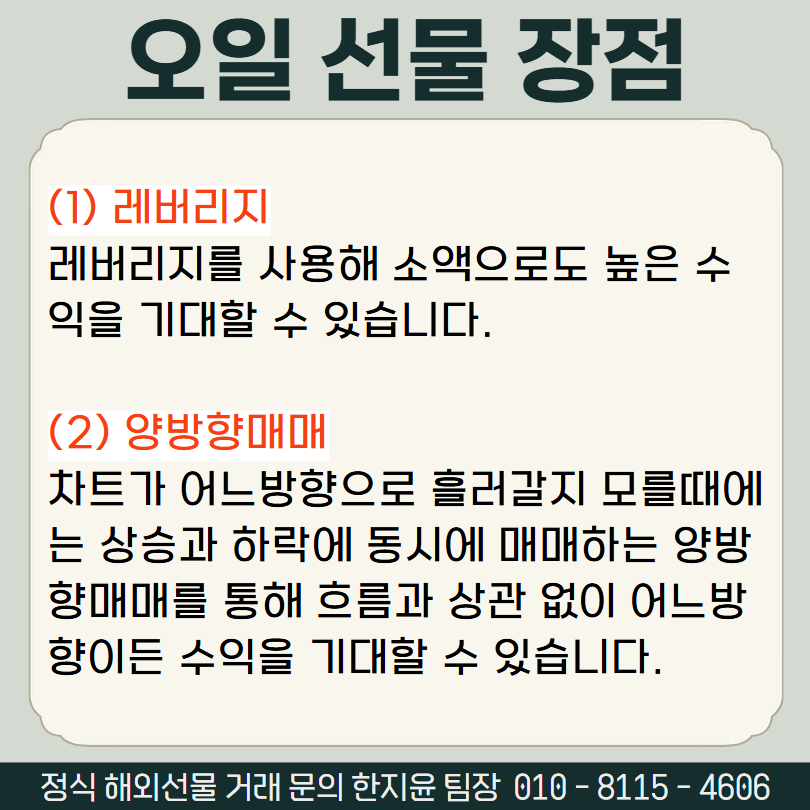 오일(Oil) 지수에 투자하는 상품으로 지수가 상승할지, 하락할지를 예측해 매수/매도 하는 거래입니다.