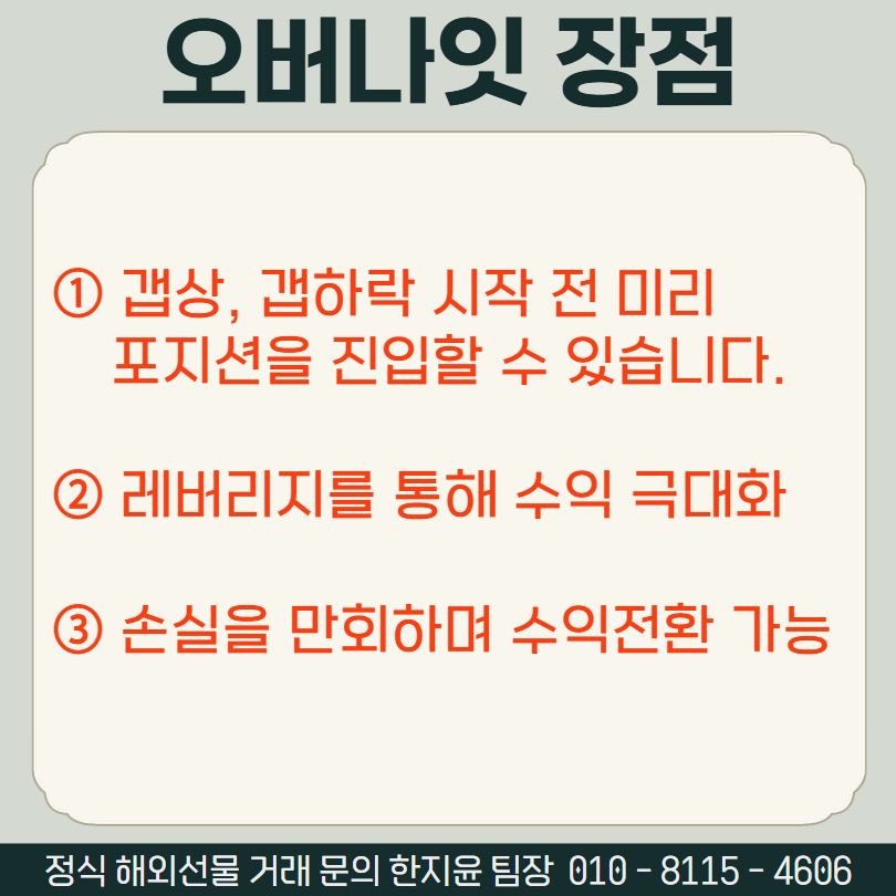해외선물은 레버리지 개념이 있기때문에 소액으로도 큰 수익효과를 볼 수가 있습니다. 때문에 오번나잇을 통해 수익을 더 극대화 시킬 수 있겠죠.