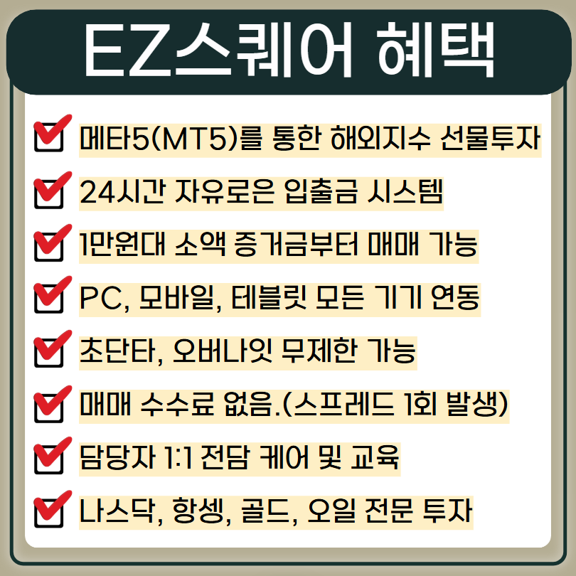 EZ스퀘어는 MT5에 정식 중개 거래소로 등재된 정식 해외거래소로 다음과 같은 혜택이 있습니다.
