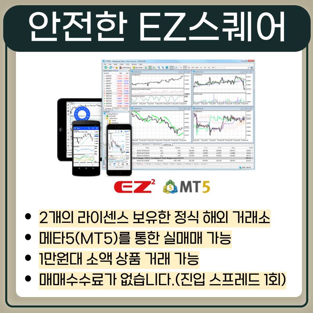 2개의 라이센스를 보유한 정식 해외거래소 EZ스퀘어는 세계적인 선물 거래 플랫폼 메타트레이더5(MT5)를 사용해 실매매가 가능합니다.