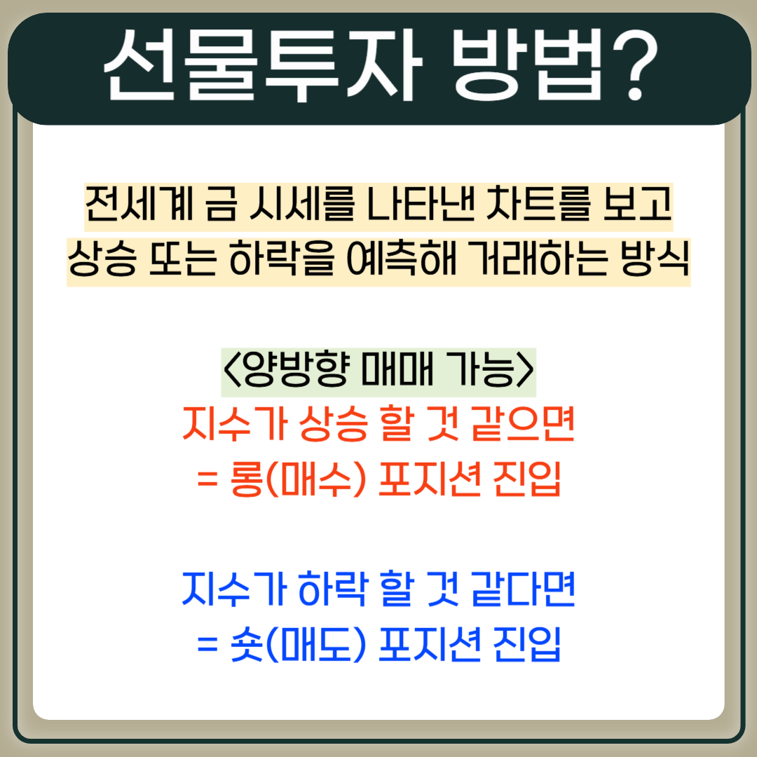 - 선물은 상승방향 뿐 아니라 하락방향도 진입을 할 수 있는 양방향 거래 상품. 그렇게 때문에 지수가 상승하든 하락하든 상관없이 양방향으로 수익 창출이 가능합니다.