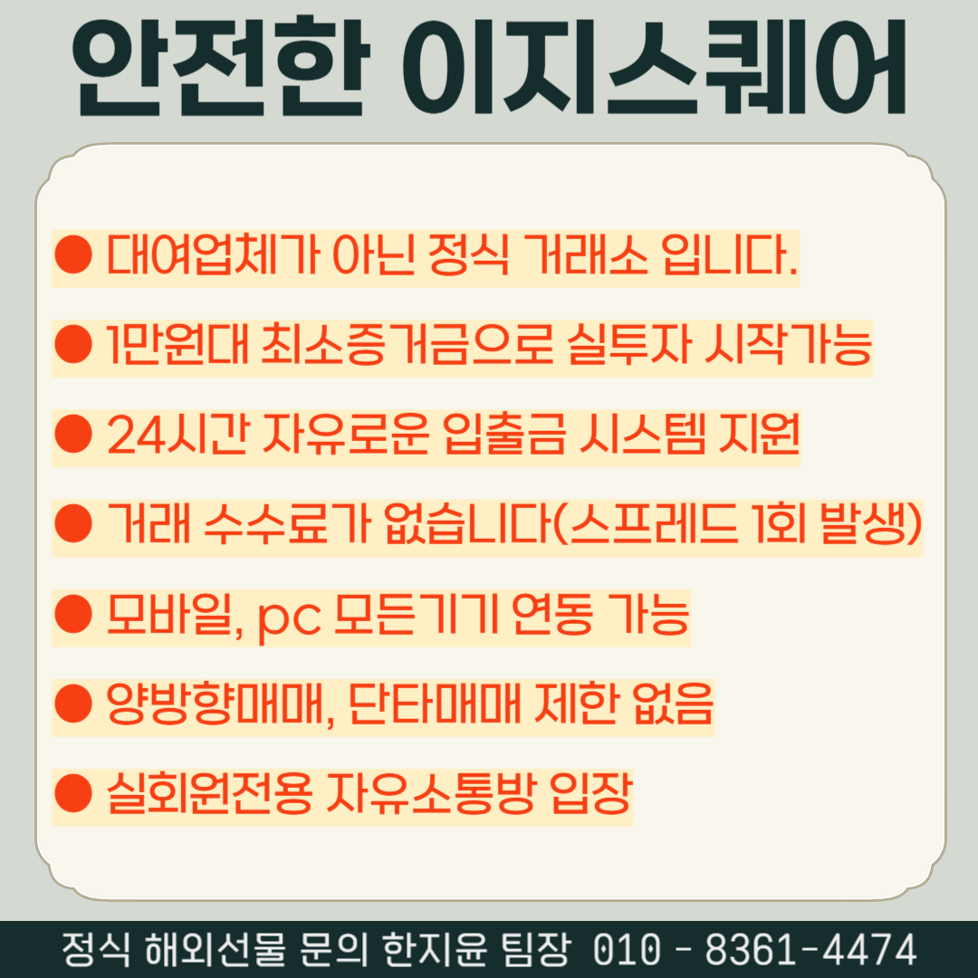 정식 중개 라이센스를 보유한 ez스퀘어에서 항셍 지수거래시 최소 18,000원 부터 거래가 가능합니다.