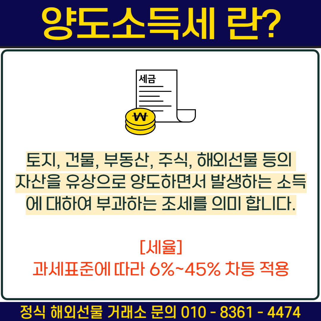 토지, 건물, 부동산, 주식, 해외선물 등의 자산을 유상으로 양도하면서 발생하는 소득에 대하여 부과하는 조세를 의미 합니다.