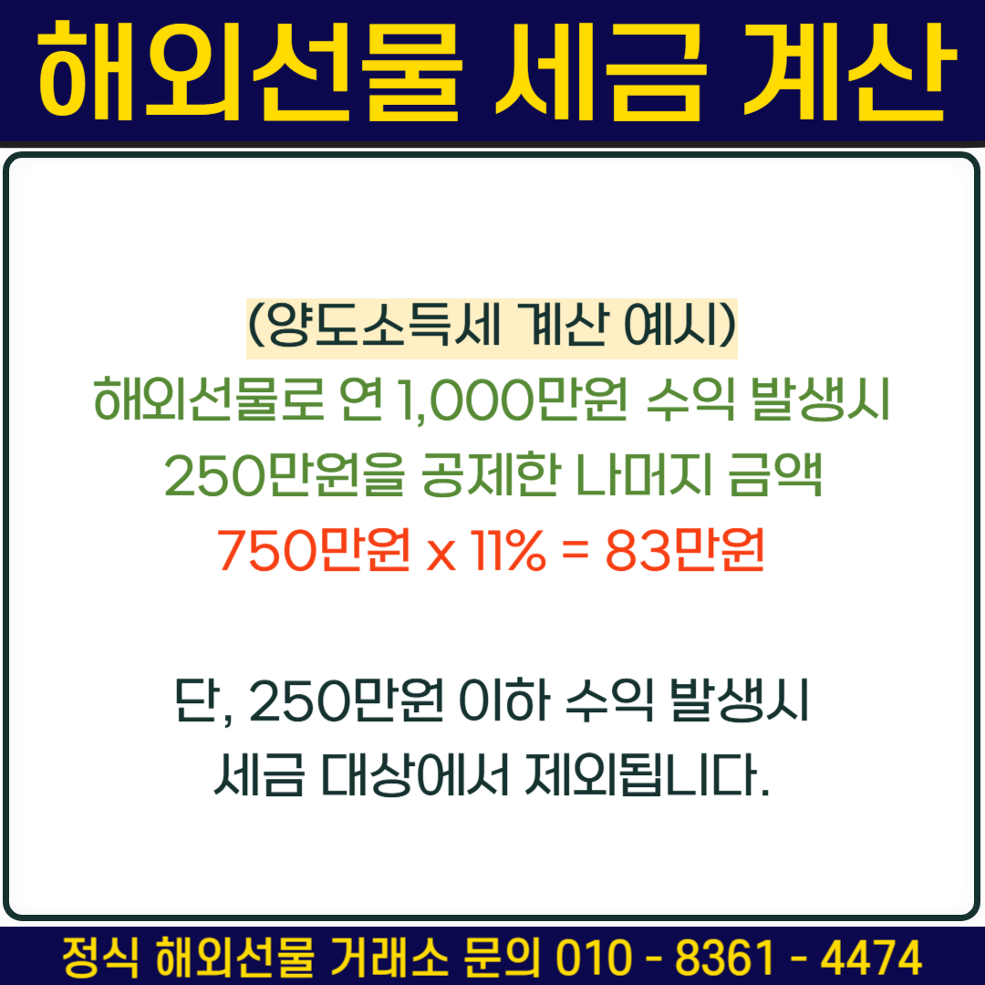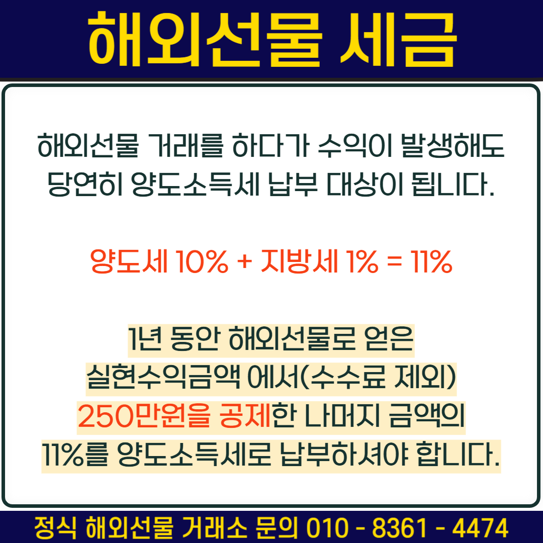 1년 동안 해외선물로 얻은 수익금액에서(수수료 제외) 250만원을 공제한 나머지 금액의 11%를 양도소득세로 납부하셔야 합니다.