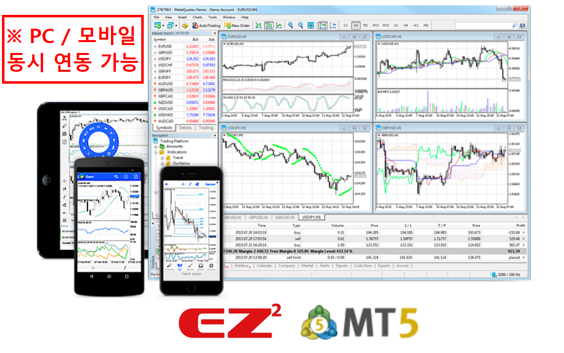 메타5(MT5) 플랫폼은 컴퓨터 HTS 버전 뿐 아니라 모바일 어플 MTS 버전까지 다양한 기기에서 연동 가능합니다.