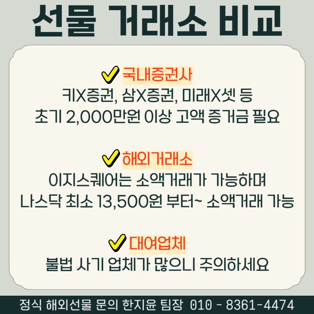 해외에서 정식 인가를 받은 거래소를 통해 해외선물을 시작하는 방법 이 있습니다. 대표적으로 '이지스퀘어' 는 2개의 정식 라이센스를 발급받은 안전한 증권 거럐소 입니다. 가장 큰 장점은 소액거래가 가능하다는 부분 인데요. 나스닥 증거금 최소 13,500원 부터~ 소액거래가 가능합니다.