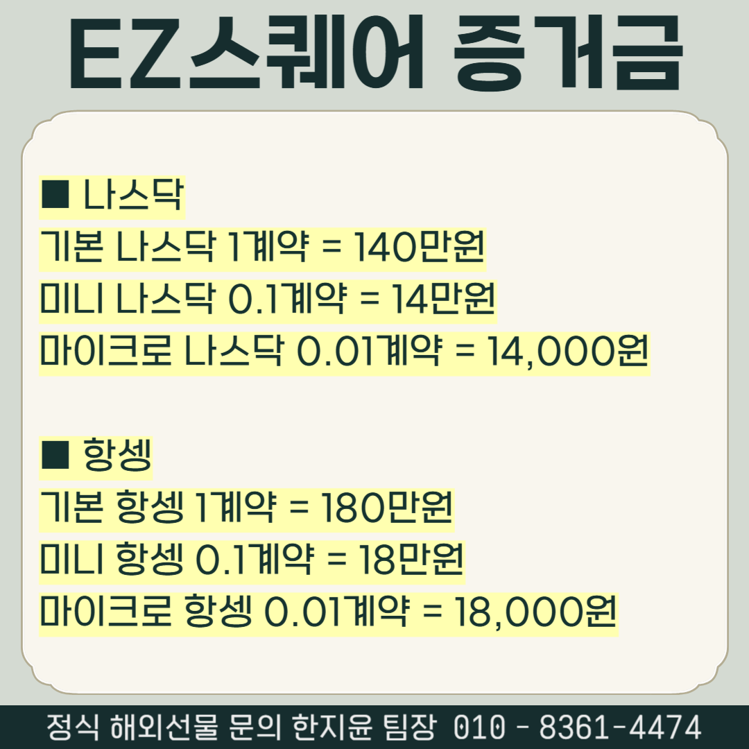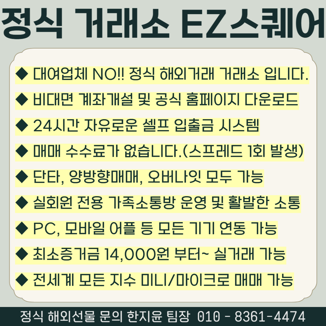 정식 해외선물 거래소 EZ스퀘어는 최소증거금 14,000원 부터~ 저렴한 거래비용으로 실매매가 가능합니다.