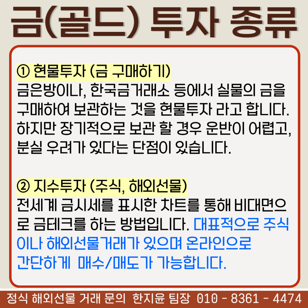 금은방이나, 한국금거래소 등에서 실물의 금을 구매하여 장기적으로 보관하는 것을 현물투자 라고 합니다. 하지만 부가적으로 세공비가 들어가며, 장기적으로 보관 할 경우 운반이 어렵고, 분실 우려가 있다는 단점이 있습니다.