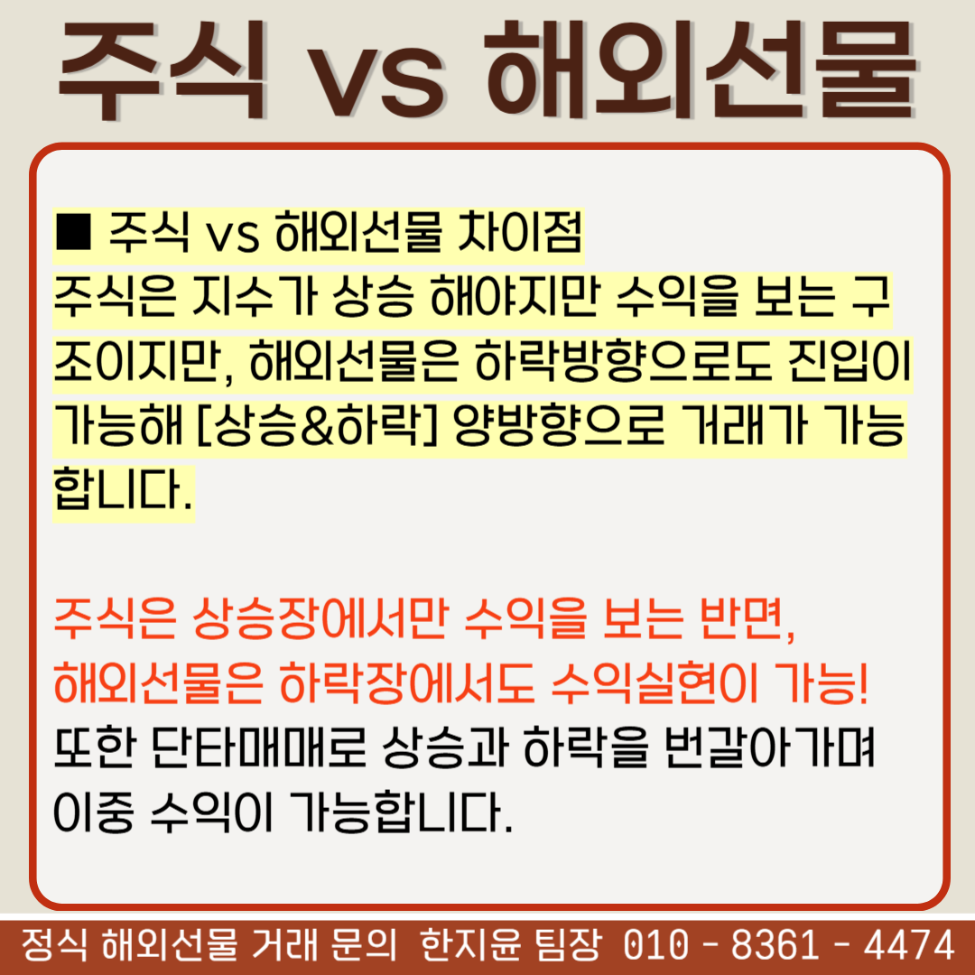 주식은 지수가 상승 해야지만 수익을 보는 구조이지만, 해외선물은 하락방향으로도 진입이 가능해 [상승&하락] 양방향으로 거래가 가능합니다.