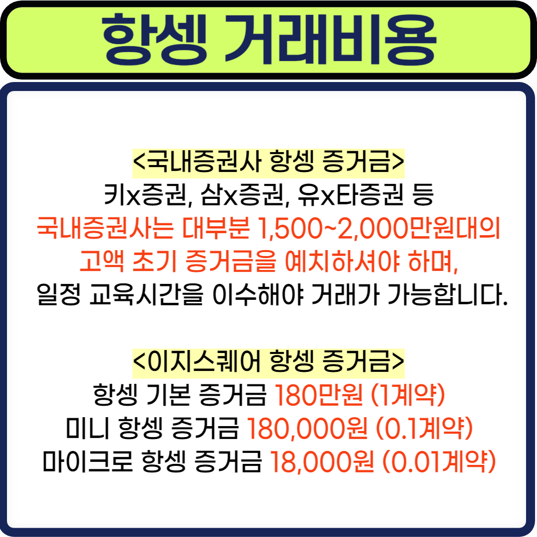 국내증권사는 대부분 1,500~2,000만원대의 고액 초기 증거금을 예치하셔야 하며, 일정 교육시간을 이수해야 거래가 가능합니다.