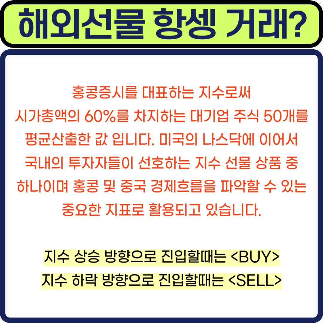 '항셍' 은 홍콩증시를 대표하는 지수로써 시가총액의 60%를 차지하는 대기업 주식 50개를 평균산출한 값 입니다. 미국의 나스닥에 이어서 국내의 투자자들이 선호하는 지수 선물 상품 중 하나이며 홍콩 및 중국 경제흐름을 파악할 수 있는 중요한 지표로 활용되고 있습니다.