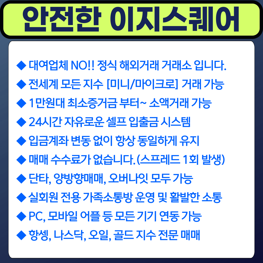 정식 해외선물 거래소 '이지스퀘어' 는 최소증거금 14,000원 부터~ 거래가 가능한 정식 선물거래소 입니다. 입출금 또한 사용자가 직접 자유롭게 셀프로 가능한 시스템이기 때문에 무엇보다 안전한 거래가 가능합니다.