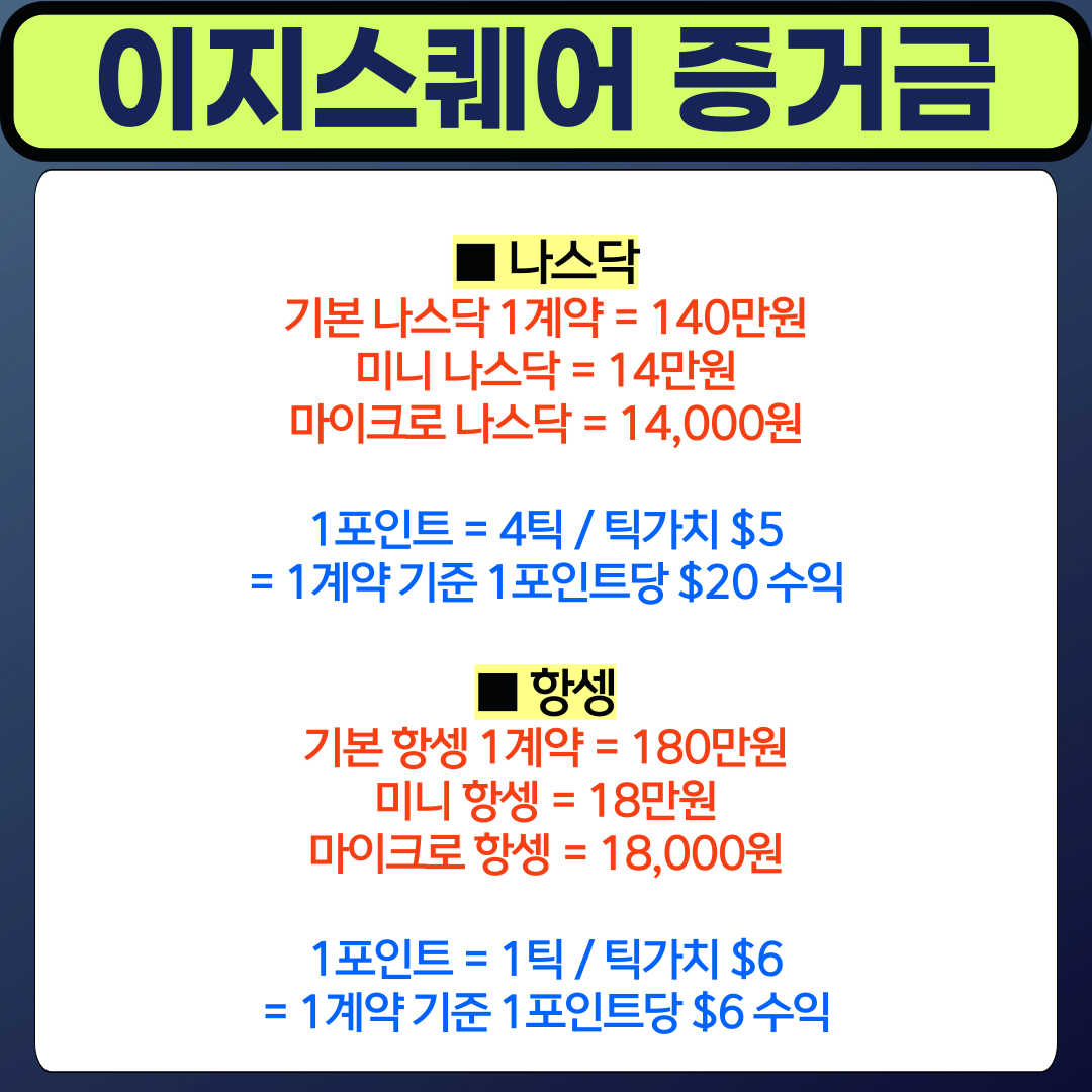 = 예를들어 키x증권, 삼x증권과 같은 국내증권사에서 나스닥 1계약 거래시 필요한 거래비용은 2천~3천만원 사이가 필요한데 비해 반면 해외거래소 이지스퀘어는 14,000원 부터 시작이 가능합니다. 이처럼 증권사별로 차이가 있습니다.