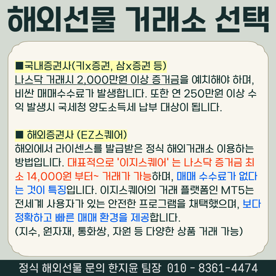 해외선물 거래 방법 중 첫번째로 증권사(거래소)를 선택해주셔야 합니다.