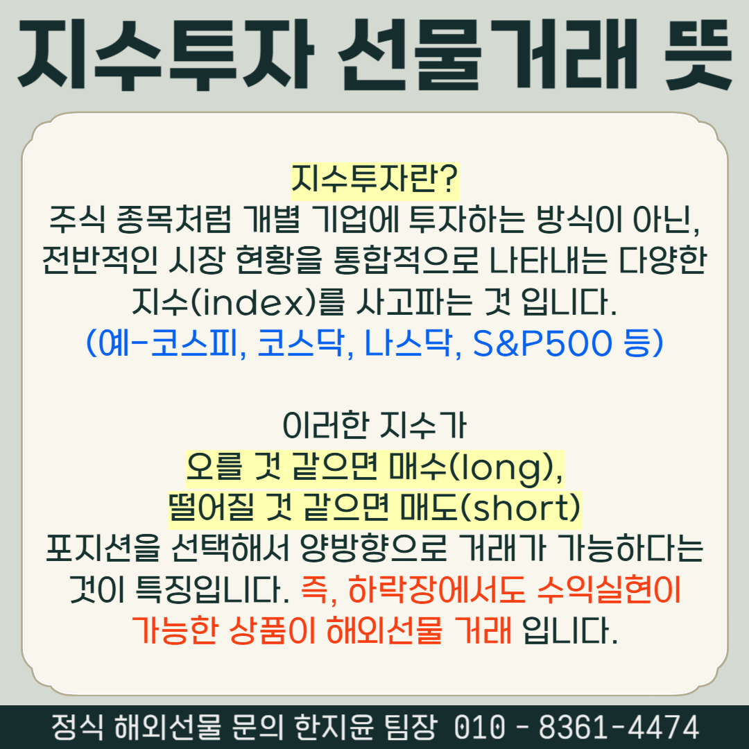 주식 종목처럼 개별 기업에 투자하는 방식이 아닌, 전반적인 시장 현황을 통합적으로 나타내는 다양한 지수(index)를 사고파는 것 입니다.