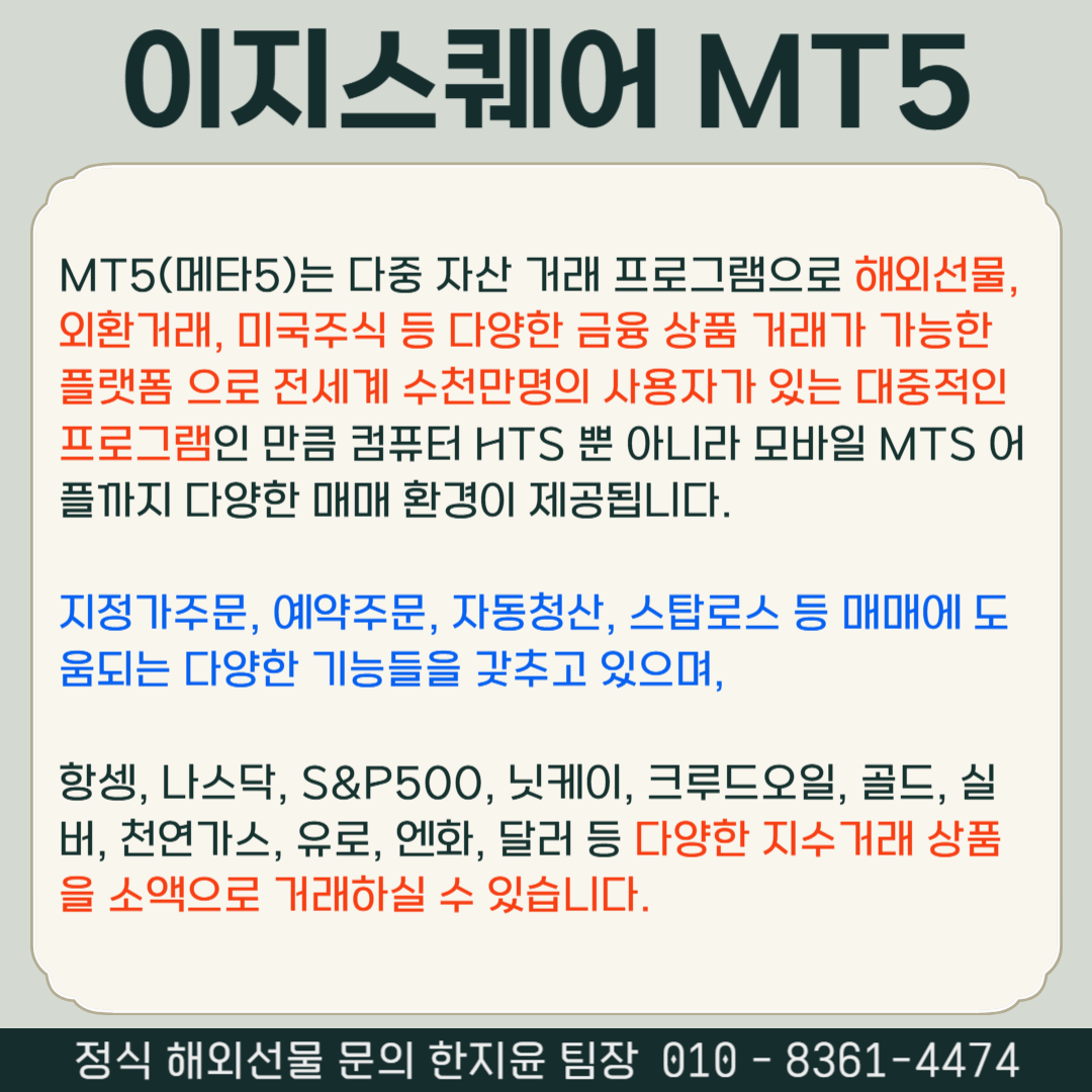 MT5(메타트레이더5)는 다중 자산 거래 프로그램으로 해외선물, 외환거래, 미국주식 등 다양한 금융 상품 거래가 가능한 플랫폼 으로 전세계 수천만명의 사용자가 있는 대중적인 프로그램인 만큼 컴퓨터 HTS 뿐 아니라 모바일 MTS 어플까지 다양한 매매 환경이 제공됩니다.